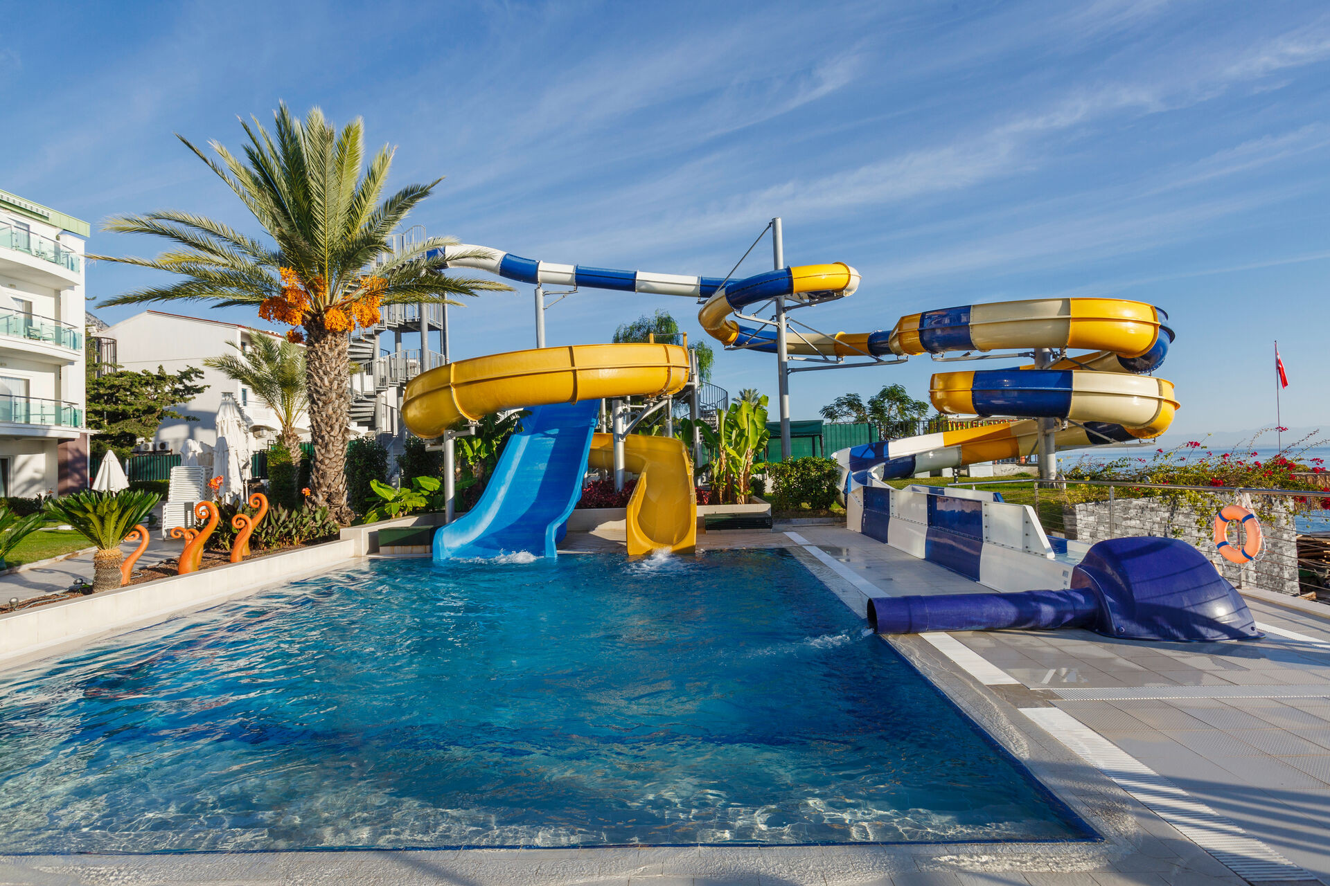 - Eén van deze zwembaden heeft 3 glijbanen